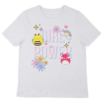 Celebrate Girl Power with this Squishmallows tee. The shirt features images of Sunny the Bee, Fifi the Fox, flowers, hearts, and a rainbow while pink letters in the background spell out, “Girl Power.” The tee comes in a white short sleeve crew neck. Fans of Squishmallows will love this comfy cotton t-shirt.