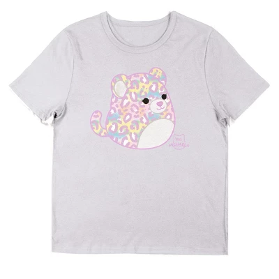 Hang out with your favorite leopard with this Squishmallows tee. The shirt features an image of Michaela the Leopard sitting next to white letters that spell out the name. The tee comes in a white short sleeve crew neck. Squishmallows fans will love this comfy cotton t-shirt.